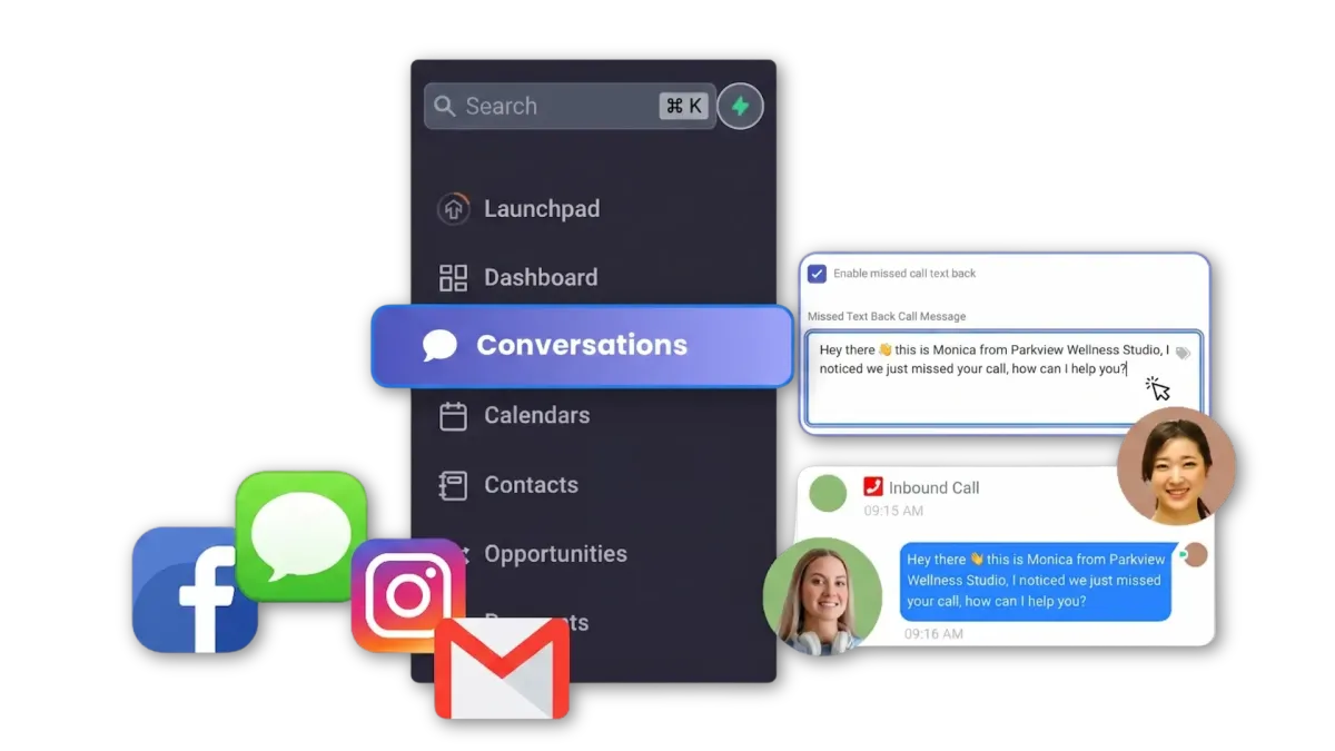 Reply to your Facebook messages, Instagram DMs, SMS, WhatsApp conversations, and Emails from one integrated inbox. Never let a prospect slip through the cracks again.